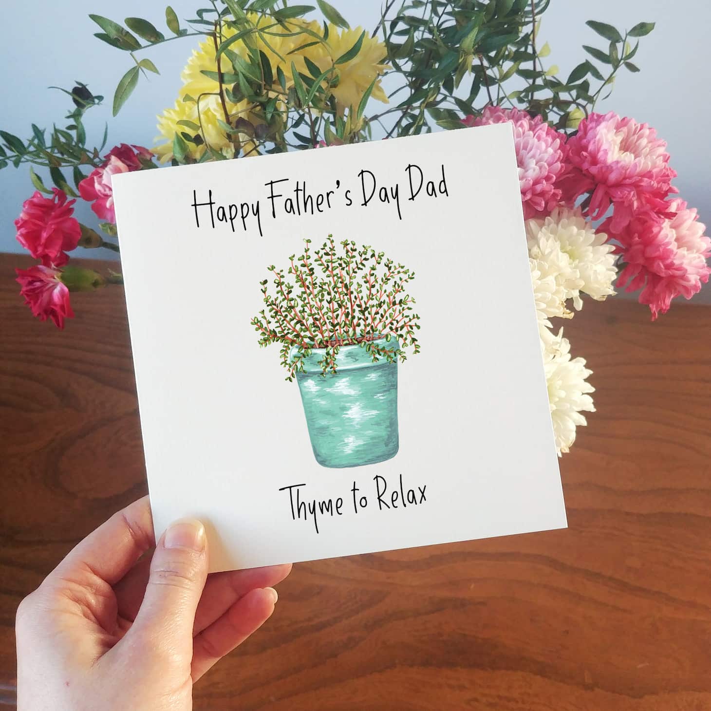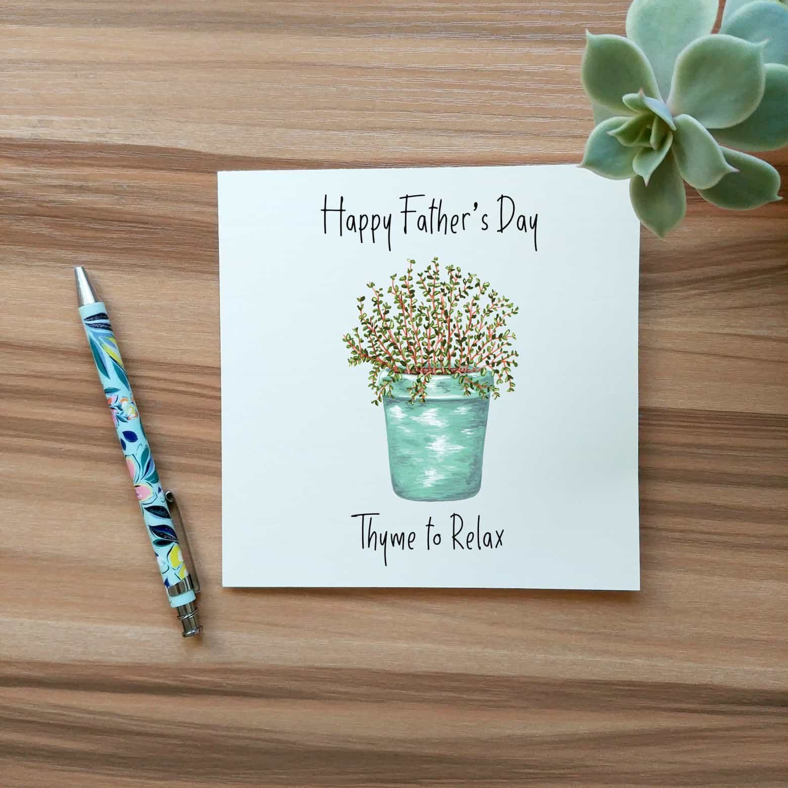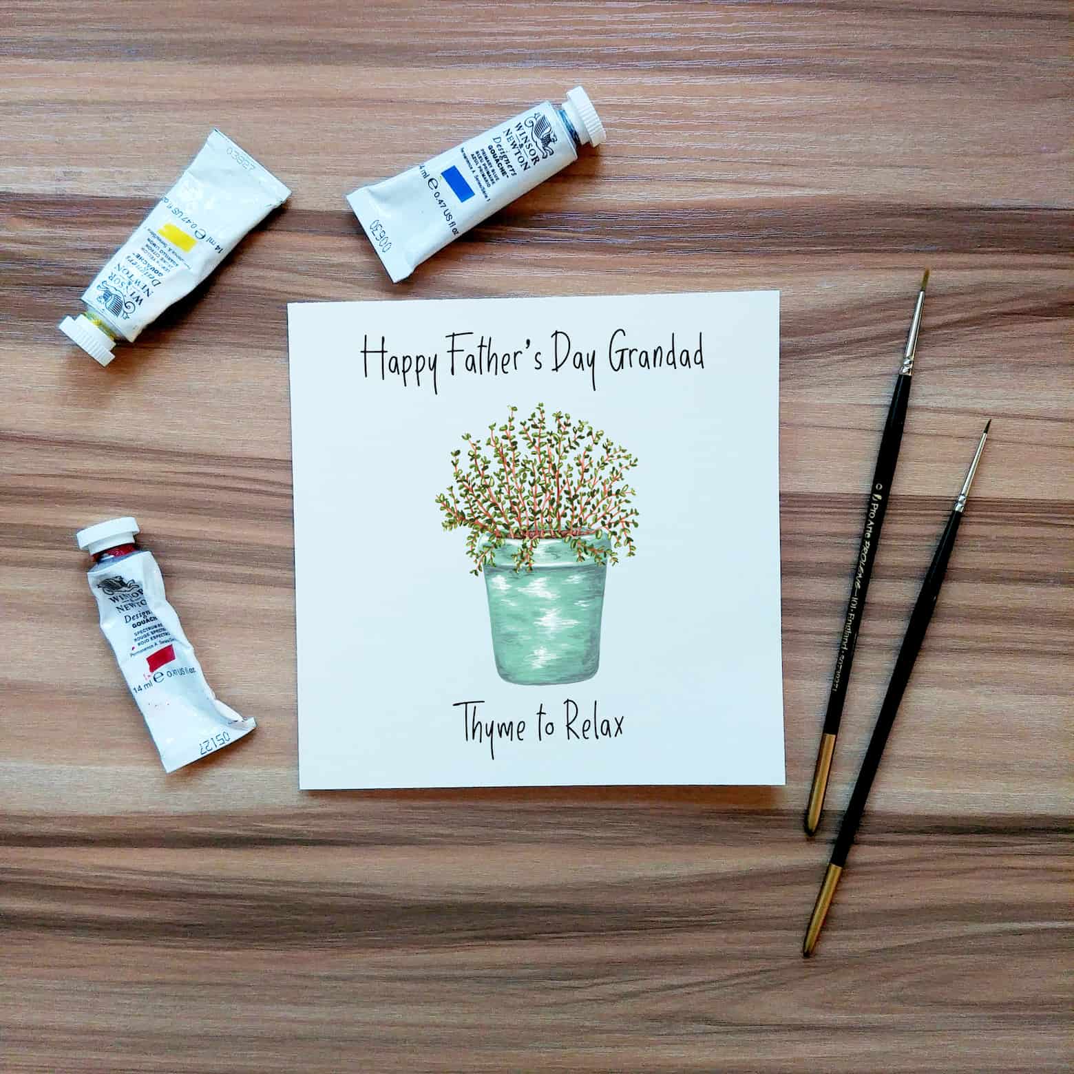 Thyme to relax fathers day card, featuring a digital print of Laura's hand-painted potted thyme plant.