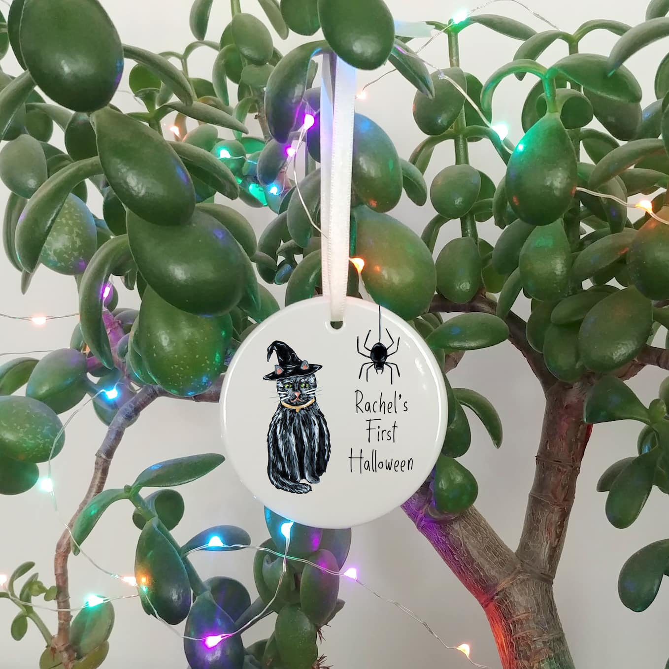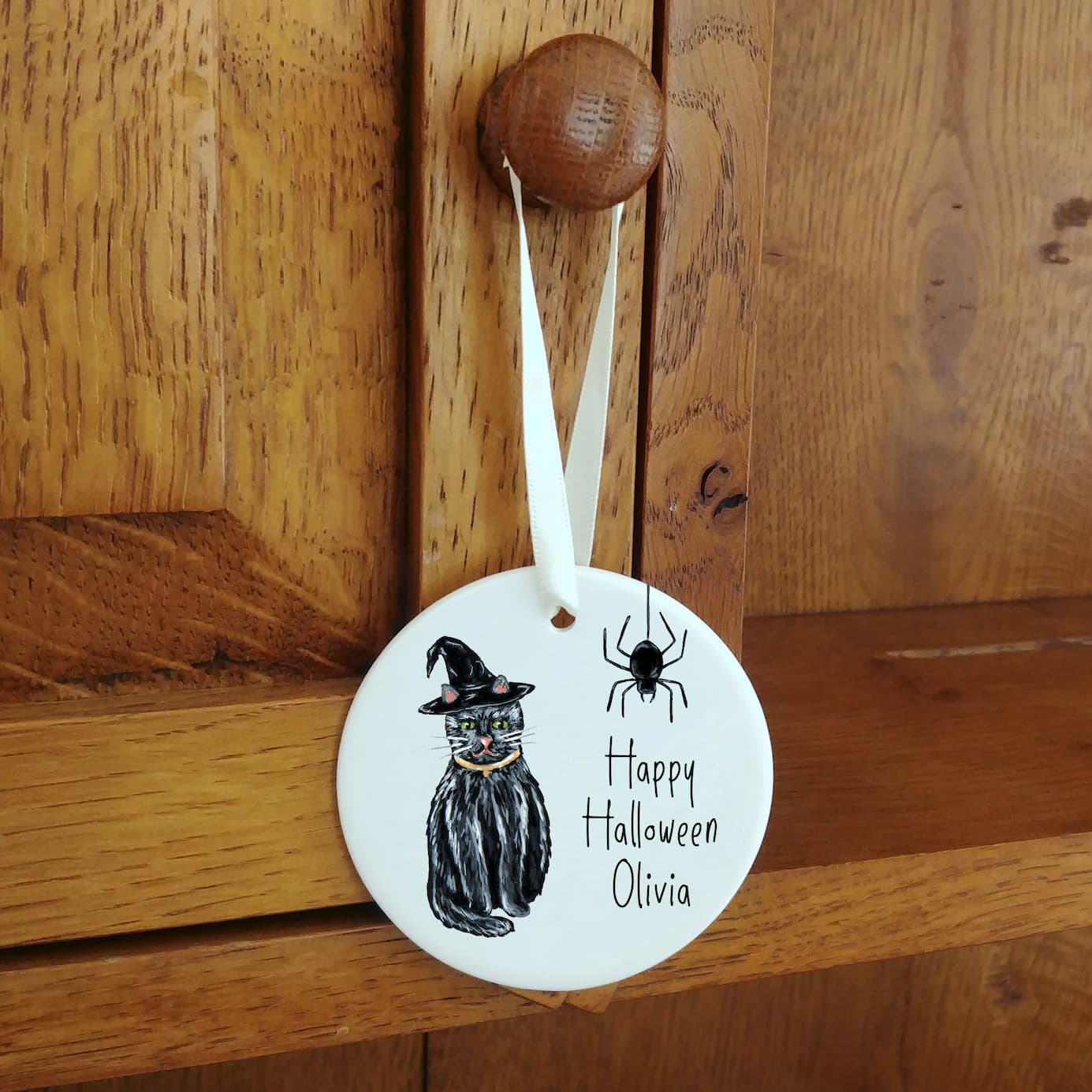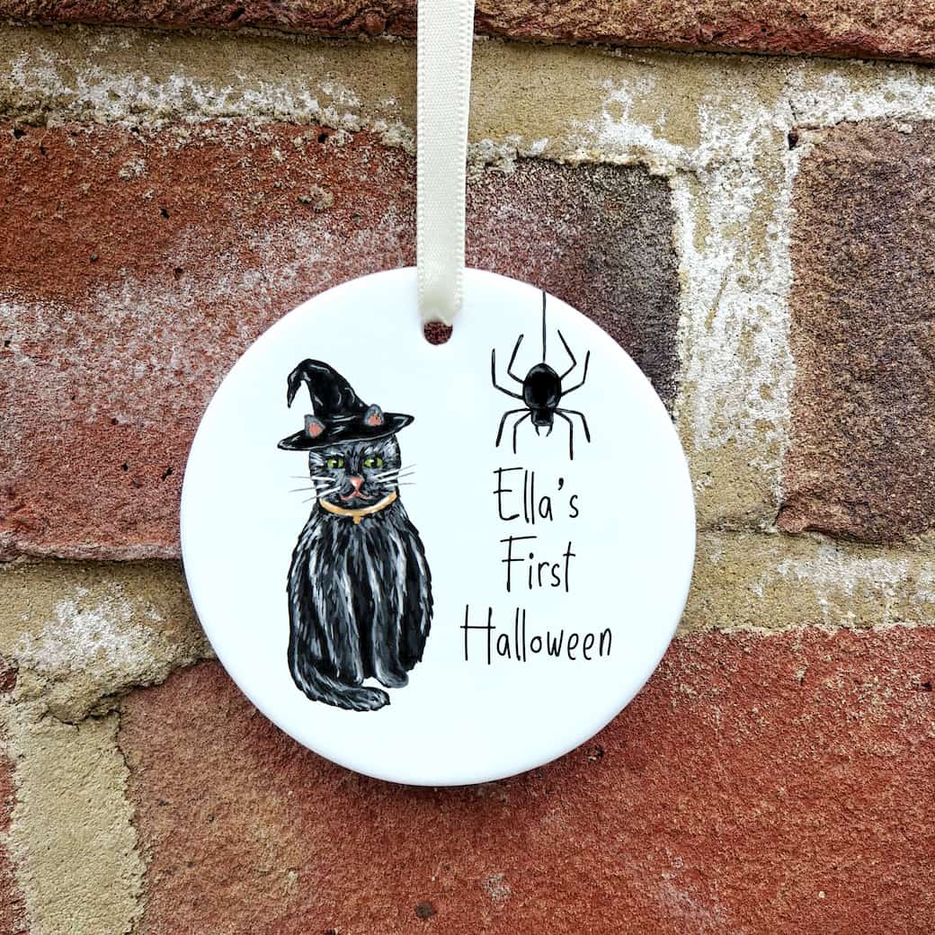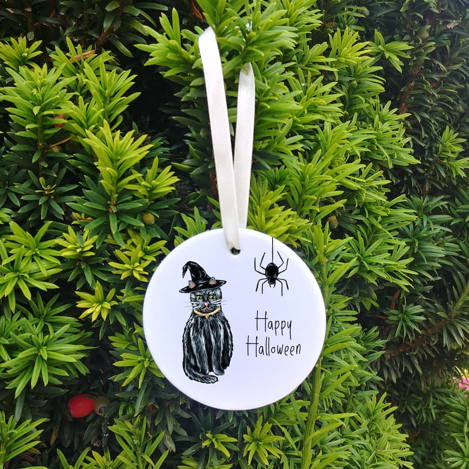 Ceramic ornaments are 7cm by 7cm and are flat, print is only on one side. Comes with a cream ribbon. Print shows Laura's hand-painted black cat with a witches hat and a spider with your personalised text.