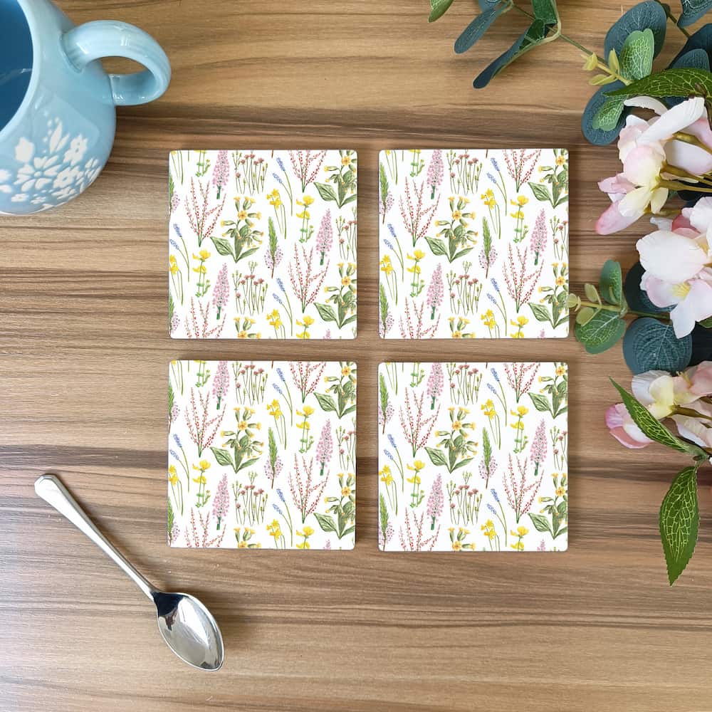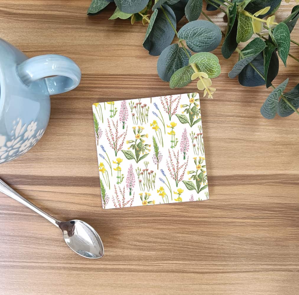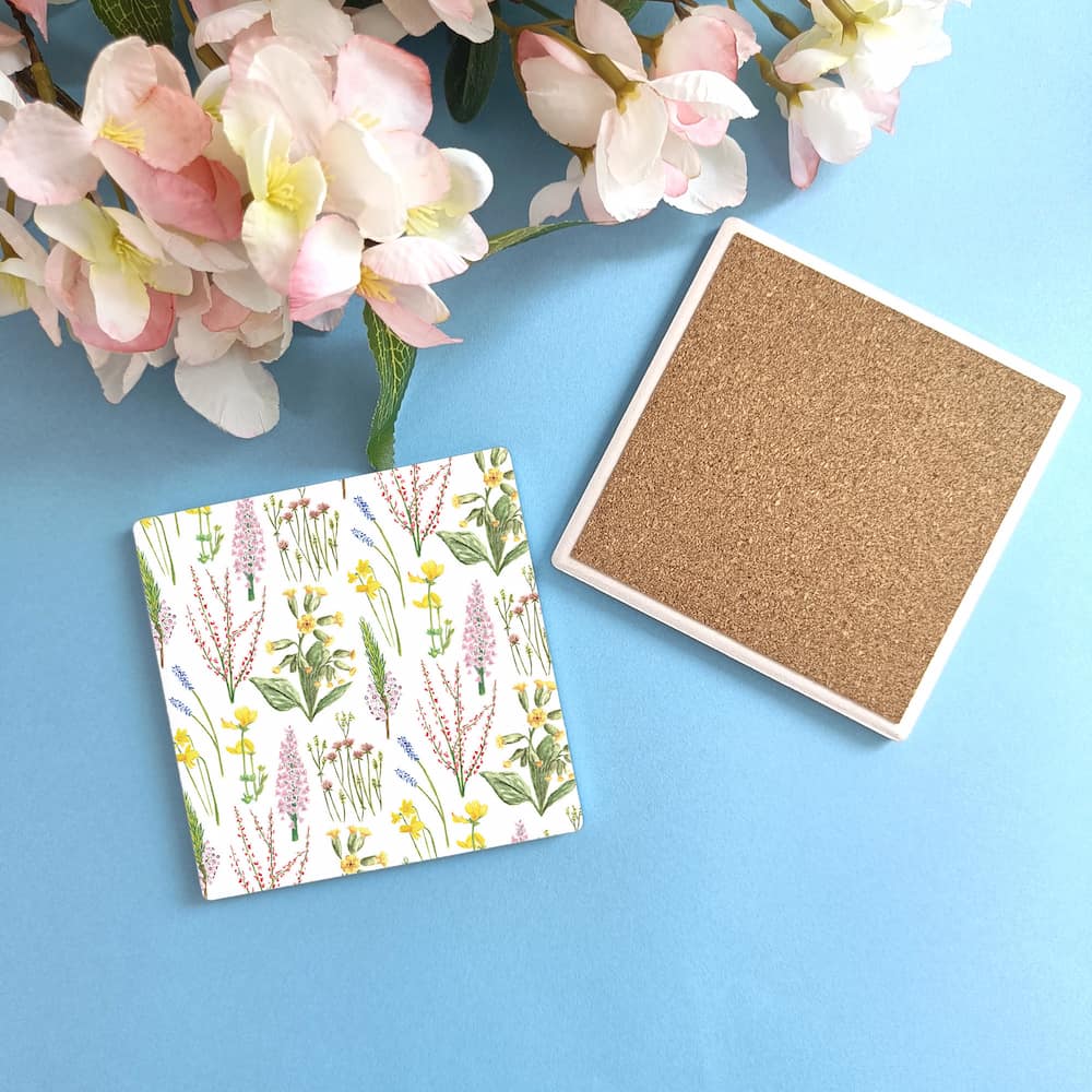 Square ceramic coasters are 9.8cm by 9.8cm with a smooth glossy finish and a cork bottom. Print shows Laura's hand-painted woodland flowers, including daffodils, cow parsley, thistles, fragrant orchid, birdsfoot trefoil, cornish heath, cowslip, and sheep sorrel.